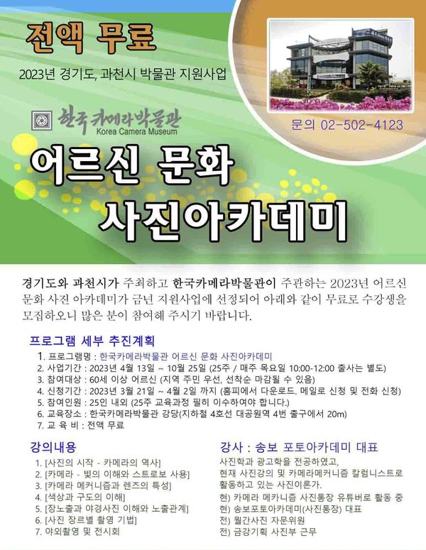 º» ¹Ú¹°°ü¿¡¼´Â Áö³ 4¿ùºÎÅÍ Áö¿ª ³» 60¼¼ ÀÌ»ó ¾î¸£½ÅµéÀ» ´ë»óÀ¸·Î ¡®¾î¸£½Å ¹®È »çÁø¾ÆÄ«µ¥¹Ì¡¯ ±³À°ÇÁ·Î±×·¥À» ÁøÇàÇÏ¿´´Ù. ¿ÃÇØ´Â ¿È¿Í °°Àº ¼ö° ½ÅûÀÌ ÀÖ¾î¼ ±ÔÁ¤ ÀοøÀ» ÃʰúÇÏ¿© 40¿© ¸íÀÇ ¾î¸£½ÅÀ» ¸ð½Ã°í »çÁø ÀÌ·Ð °ÁÂ¿Í ´õºÒ¾î ÇöÀå Ãâ»ç¸¦ 5ȸ ½Ç½ÃÇÏ¿´´Ù. ¿ÃÇØ »çÁø °ÀǸ¦ ¸Ã¾ÆÁØ °»ç·Î´Â ¡®»çÁøÅëÀ塯À̶ó´Â À¯Æ©¹ö·Î Ȱµ¿ÇÏ´Â ¼Ûº¸ °»çÀÇ Áöµµ·Î Ä«¸Þ¶ó¶ó´Â µµ±¸¸¦ »ç¿ëÇØ¼ ÀÚ½ÅÀÇ ½Ã°¢ÀûÀÎ °¨Á¤À» »çÁøÀ¸·Î ½ÂÈÇÏ¿´´Ù. 25ÁÖ¶ó´Â ±ä ¿©Á¤À» ³¡±îÁö ÇÔ²²ÇÑ ¾î¸£½ÅµéÀÇ °á°ú¹°À» ¿©·¯ºÐµé°ú ÇÔ²² ³ª´©°íÀÚ 9¿ù 14ÀÏ(¸ñ)ºÎÅÍ 10¿ù 5ÀÏ(¸ñ)±îÁö »çÁøÀüÀ» º» ¹Ú¹°°ü °´ç¿¡¼ °³ÃÖÇÏ¿À´Ï ¹æ¹®Çϼż ¾î¸£½ÅµéÀÇ »îÀ» ³Ë³ËÈ÷ ³ª´©´Â ¿¹¼úÀÇ ¼¼°è¿¡ Àá½Ã ½¬½Ã°í ¸¶À½À» ´Ùµ¶À̽øé ÁÁ°Ú´Ù.